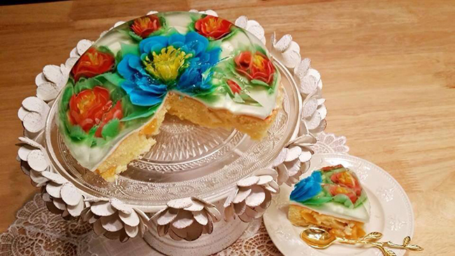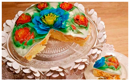 El método "Gelatorta" que consiste en la elaboración de una tarta de gelatina con el bizcocho encapsulado y decorado con diferentes métodos: calado,óleo y transfer.
